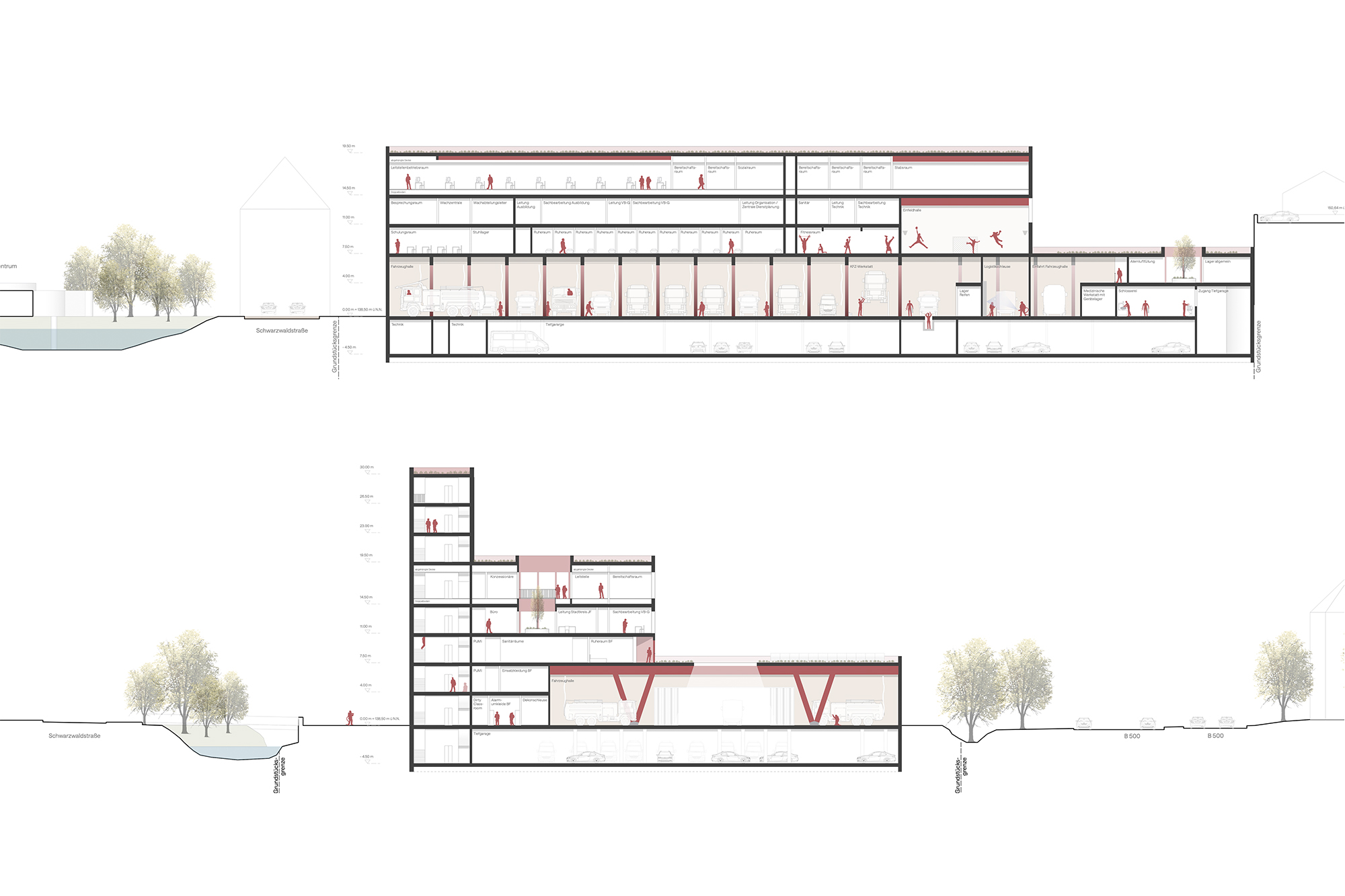 Die räumliche Trennung zwischen der Freiwilligen Feuerwehr im südwestlichen Gebäudeteil und der Berufsfeuerwehr mit Leitstelle im übrigen Baukörper wird durch separate Zugänge und differenzierte Erschließungssysteme konsequent unterstützt. Der 30 m hohe Übungsturm löst sich bewusst vom Hauptbaukörper und bildet ein weithin sichtbares, identitätsstiftendes Zeichen. Der Hauptzugang mit vorgelagerter Platzfläche orientiert sich zur Hauptstraße. Dieser öffentlich zugängliche Freiraum dient zugleich als Übungsfläche für die Feuerwehr und schafft eine klare Adressbildung im Stadtraum.