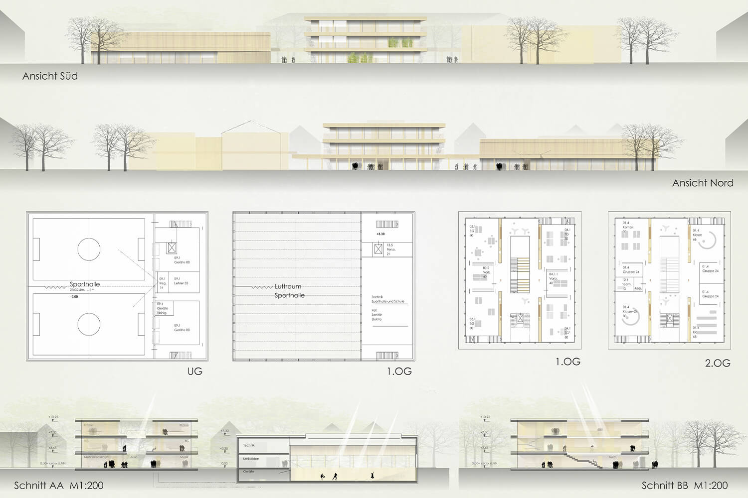 Der Entwurf sieht eine Ergänzung des bestehenden Ensembles durch zwei Punkthäuser im Süden vor. Durch diese Positionierung entsteht eine geschützte Innenhofsituation. Die Neubauten bilden eine angemessene Abschirmung des Pausenhofs gegenüber der umgebenden Wohnbebauung. Gemäß der bestehenden Verknüpfung der einzelnen Schulgebäude mittels Vordächer werden diese ergänzt, um eine optimale Anbindung der beiden neuen Gebäudeteile an das Ensemble zu schaffen.